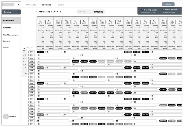 Bookings is an example of a new area of the product that the team designed. The need to manage reservations and room statuses within the context of time was found to be imperative to a smooth operational workflow.